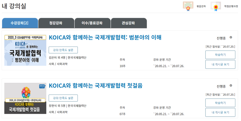나는 최근에 ODA자격증 갱신을 위해 KOICA ODA 교육원에서 K-MOOC를 통해 보충교육을 들으라는 공지를 전달받아 처음 케이무크를 활용하게 되었다.