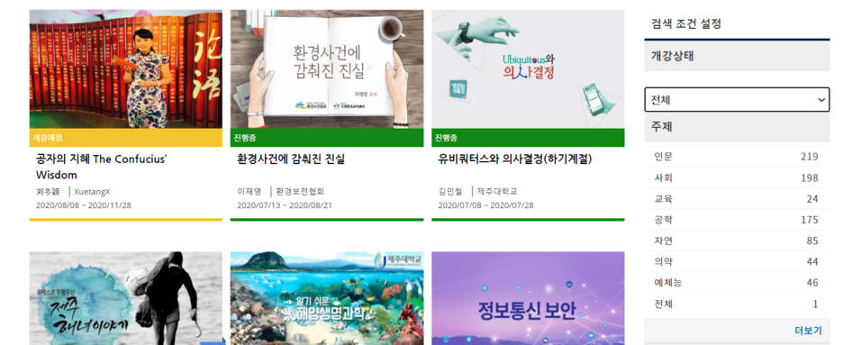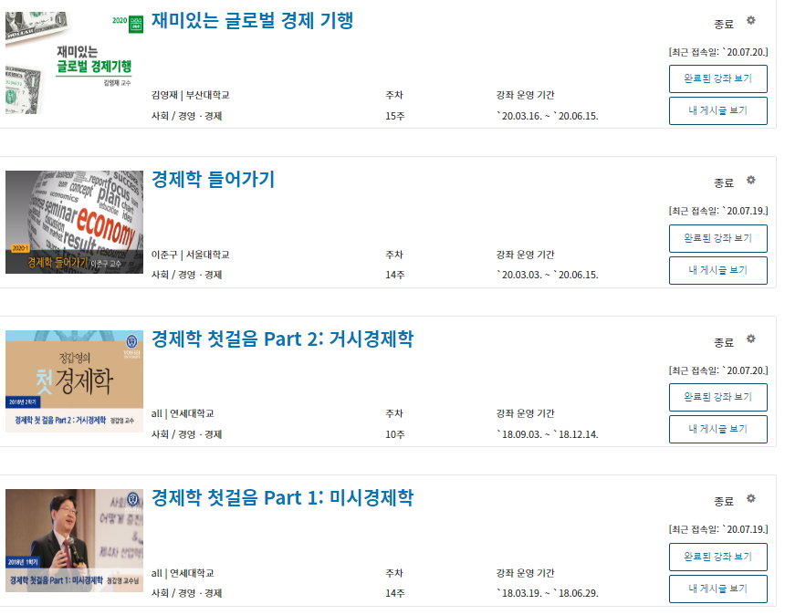 주제는 다양한데, 개인적으로 어떤 공부를 하려고 할 때 일단 K-MOOC에서 원하는 강의가 있는지 확인해보면 좋을 것 같다. 나 같은 경우는 현재 경제학을 공부하고 싶어서 경제라고 검색을 하니 꽤 괜찮은 강의들이 많았다. 대중들을 대상으로 하는 강의다 보니 수준이 매우 높거나 어렵지 않아서 입문을 위한 공부로 활용도가 좋은 것 같다.