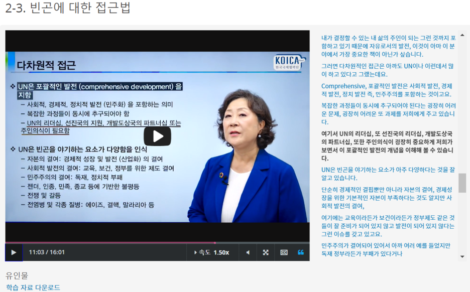 내가 현재 수강하고 있는 강좌는 KOICA 국제개발협력 분야이고, 기대하지도 않았는데 강의수준이 매우 높아서 놀랐다. 자료화면도 풍부하고 자막도 한글과 영문 둘다 제공된다. 특정 강의 같은 경우는 무료로 공부자료를 배포하고 있어서 혹시 ODA 자격증을 준비하는 분들에게 도움이 될 것 같다. 강의의 퀄리티는 강좌를 제공하는 기관에 따라서 달라지는 듯 했다.