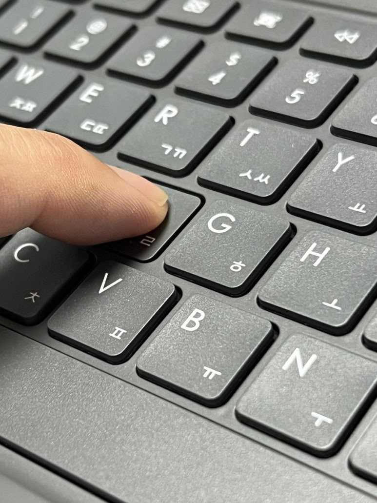 꾹 누르면 이런 형태. 확실히 눌리는 맛이 있는 편. 소리가 완전 안들리는 무소음은 아니고 까페나 오픈된 도서관에서는 충분히 써도 전혀 신경 안쓰일 정도 같다. 예민한 사람들이 가득한 독서실에서는 너무 빠르고 강하게 누르면 클레임을 받을수 있겠지만 그건 노트북도 마찬가지니 이해가능. 오히려 무소음이어서 타건감이 너무 없으면 그게 더 불호일것 같다.