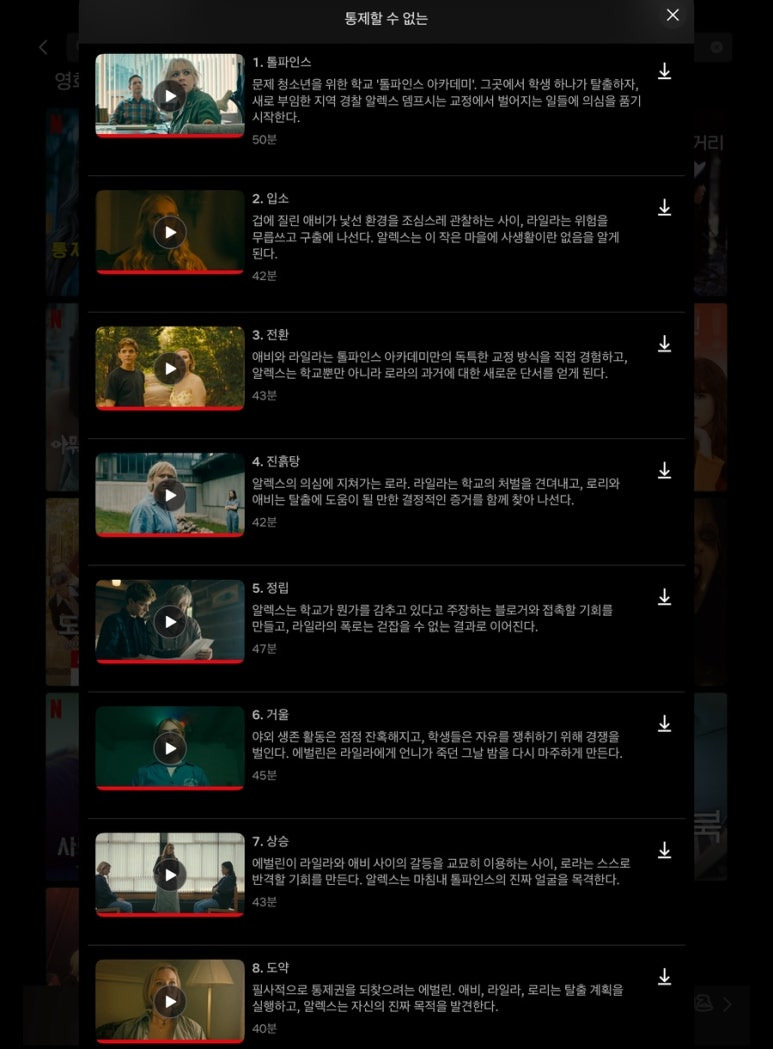 #통제할수없는넷플릭스 기본적으로는 10대 소녀 2명의 우정과 약간 정신병동 느낌나는 문제아 교정학교로 강제적으로 보내지면서 그 곳에서 일어나는 이야기를 다루고 있다. 소재 자체는 되게 재밌었고 캐릭터들의 특징도 명확히 보여서 전체적으로 호감을 가지고 시청을 했지만, 학교에서의 탈출기와 그 숨겨진 비밀을 파헤치는 그 중간에서 뭔가 애매함이 남았던 것 같다.