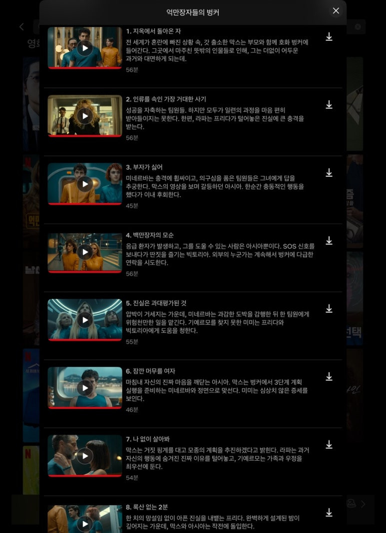 주말에 몰아보기 하려면 통제할수 없는을 추천하고 하루에 하나씩 보상용으로 저녁에 누워서 편히 보려고 한다면 억만장자들의 벙커를 추천하고 싶다. 두 작품다 아쉬움이 있어서 압도적인 추천이 자신하기 어렵지만 시간이 아깝다는 생각은 들지 않을 정도였다. 굳이 평점을 매기자면 5점 만점에, 통제할수없는 3.8점 그리고 억만장자들의 벙커 4.0점이라고 할 수 있겠다.