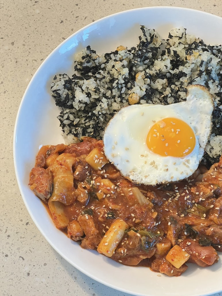 너무 졸렸더니 #닭갈비덮밥 비쥬얼이 되었다. 마치 급식실에서 자주 마주쳤던 것 같은 비쥬얼....ㅎ 김가루를 듬뿍 넣은 주먹밥과 계란후라이로 장식. 엽떡 양념 덕분인지 꽤나 그럴싸한 맛이 남. 함께 먹은 이에게도 따봉을 받았다.