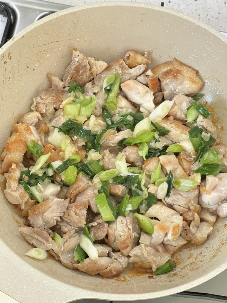 순살 닭고기의 껍질 부분은 최대한 바삭하게 구워주고 양쪽으로 얼추 익으면 가위로 잘라주기. 대파와 마늘을 넣고 다시 볶아주기 반복. 대파가 닭기름에 잘 구워질 때까지 볶아줍니다.
