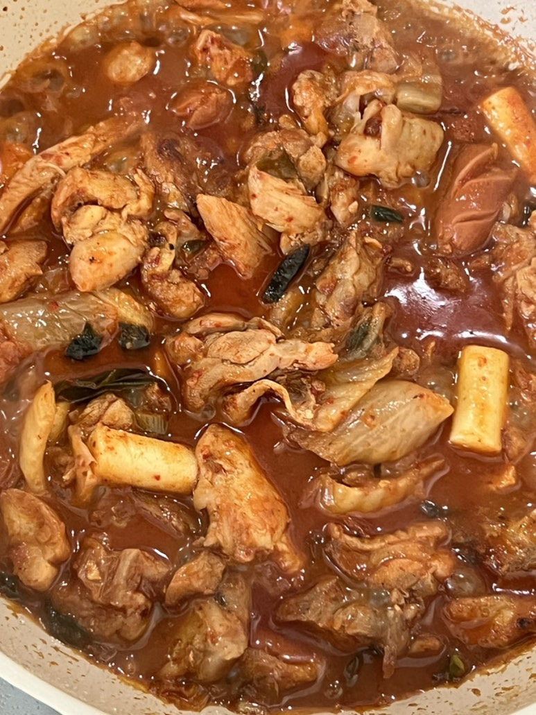 약간 김치 찜닭 같기도 하네요 국물으 좀 더 졸였더니 김치찜닭 비쥬얼이 되어버렸다. 졸이지 말고 그냥 국물은 좀 더 넉넉하게 놔둘 걸 살짝 후회.