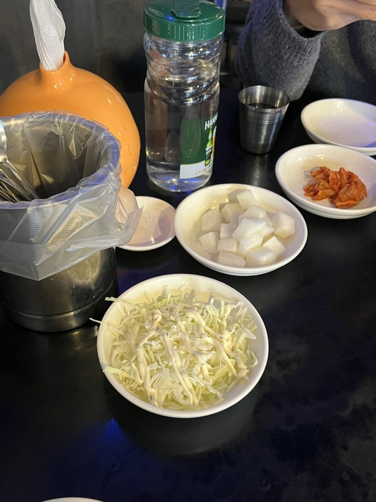 기본찬은 양배추랑 치킨무. 치킨무가 아삭하니 신선한 느낌이라 좋았고 양배추는 마요네즈가 아니라 약간 랜치드레싱을 뿌려놓은 느낌이었다. 케요네즈가 아닌게 아쉽다는 함께간 이의 후기. 난 고소한 드레싱 소스에 만족함.