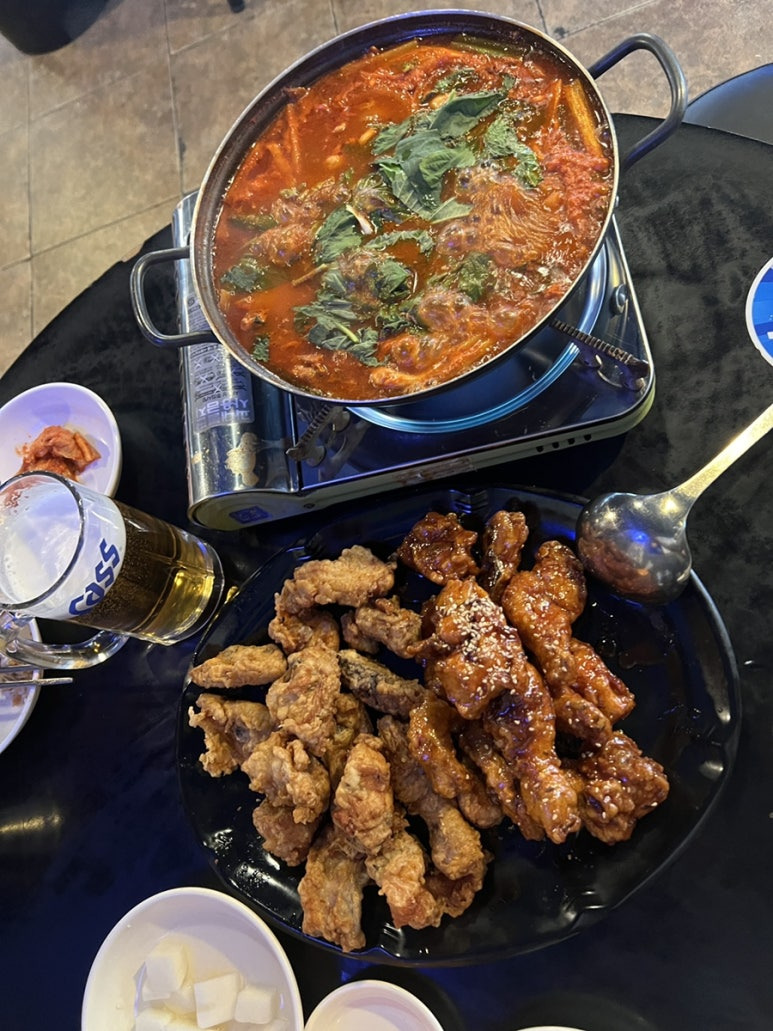 내가 먹은건 #반반치킨 #닭내장찌개 소짜 그리고 #크림생막주 2명이서 먹기에는 좀 많은 편이었는데 소식좌들은 치킨이나 내장찌개 둘중에 하나만 시켜야 할듯. 3명이서 먹기에는 치킨과 내장찌개소자로 하면 적당하지 않을까 싶음.