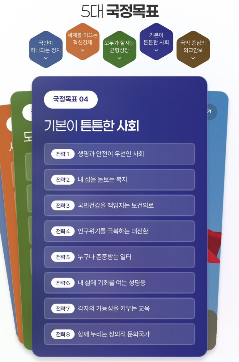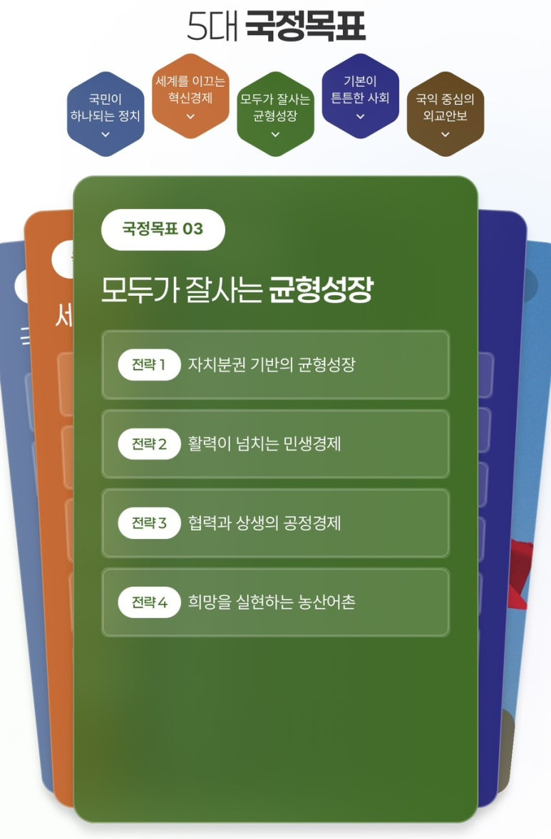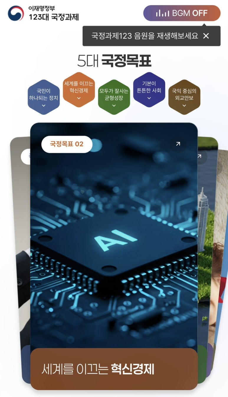 국민주권 정치, 혁신경제, 균형성장, 튼튼한 사회, 외교안보 등 5대 국정목표로 새로운 대한민국을 만들어가는 이재명정부의 123대 국정과제를 확인하세요.