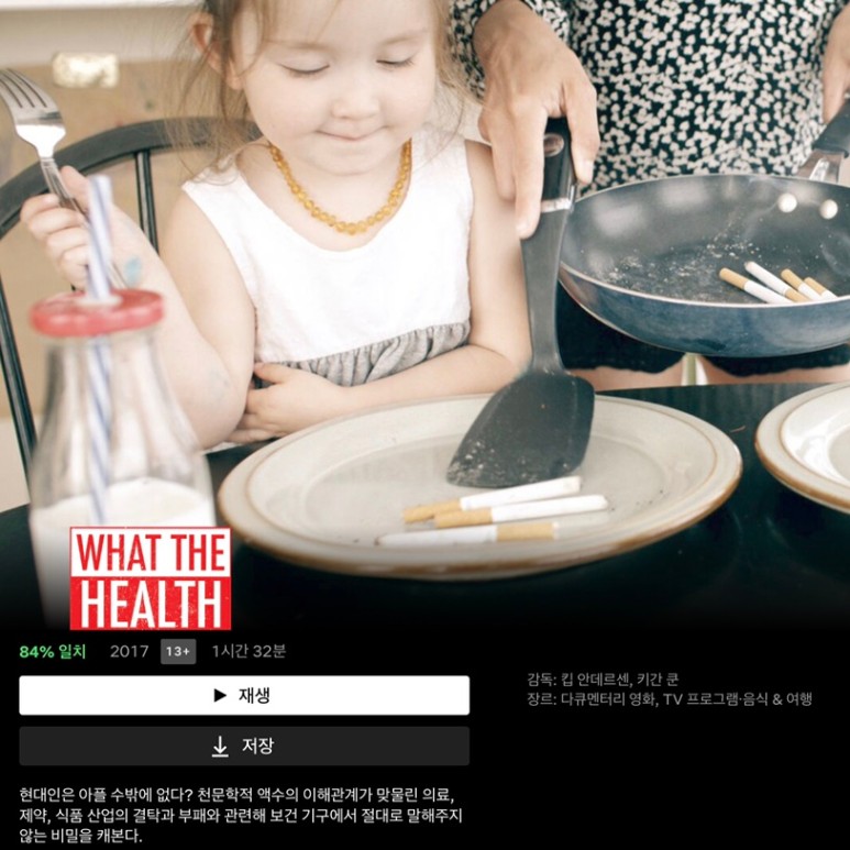 최근에 넷플릭스에서 #채식주의 #지구환경 등과 관련된 다큐멘터리를 연속적으로 보면서 사실 어떤 내용을 어디에서 봤는지 좀 헷갈린다 ㅎ 씨스피라시, 더게임체인저스 에 이어 #왓더헬스 까지, 이 세가지 중에 하나만 보라고 한다면 이 작품을 볼 것을 추천한다.
